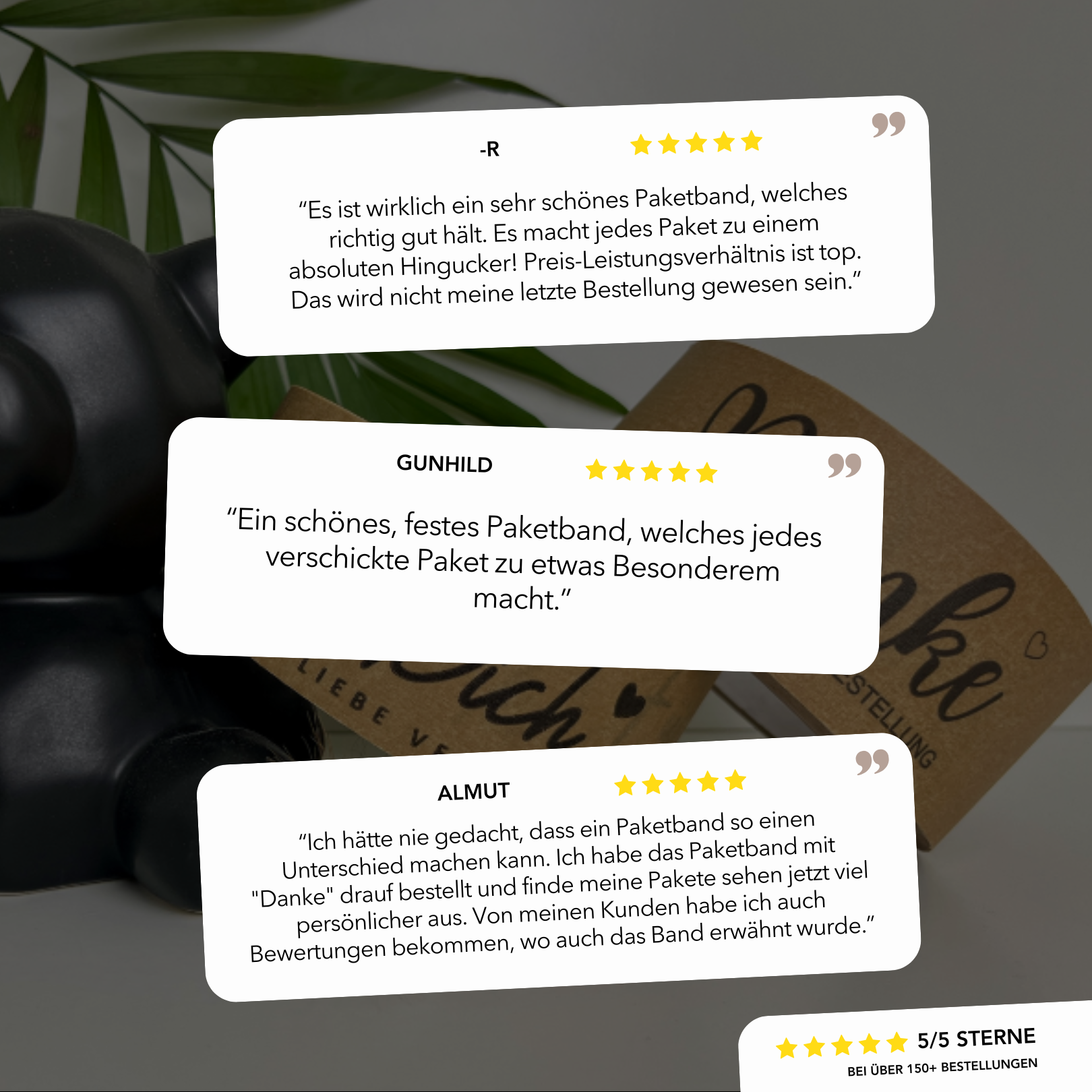 "Es ist wirklich ein sehr schönes Paketband, welches richtig gut hält. Es macht jedes Paket zu einem absoluten Hingucker! Preis-Leistungsverhältnis ist top. Das wird nicht meine letzte Bestellung gewesen sein."